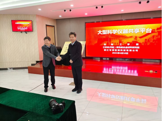 4月10日,我校与江苏省(丹阳)高性能合金材料研究院、镇江专博检测科技有限公司合作共建的大型科学仪器共享平台揭牌仪式在丹阳市高新区江苏省(丹阳)高性能合金材料研究院举行。江苏省科技资源统筹服务中心副主任尤琛辉、丹阳市科学技术局局长王小南,我校实验室建设与设备管理处处长孙爱东、建材研究院分析测试中心等部门负责人参加揭牌。揭牌仪式由江苏省分析测试协会秘书长赵厚民主持。